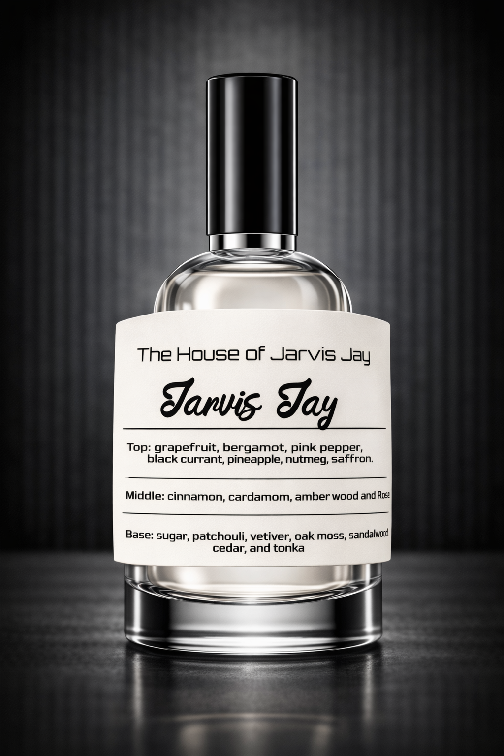 Top: grapefruit, bergamot, pink pepper, black currant, pineapple, nutmeg, and saffron